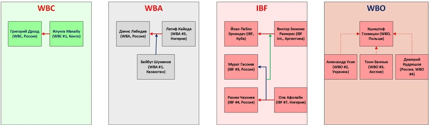 Видно, что по версиям WBC и WBA ситуация полностью определена: у наших чемпионов есть обязательные претенденты, с которыми им нужно будет драться или в следующих боях, или через бой. Чуть сложнее ситуация по версии IBF, где не все бои пока согласованы или вообще возможны, но и она в целом линейна. С WBO сложнее.