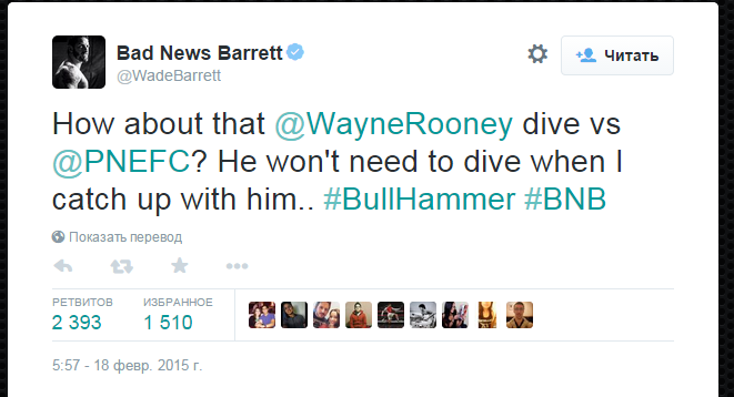 Руни в ответ отшутился, что согласится, если за него будет драться другой боец — Стив Остин по прозвищу Ледяная Скала. Барретт же выбрал себе в напарники 37-летнего форварда «Престона» Кевина Дэвиса. Давняя история так ушла в архивы "Твиттера" и была забыта до вчерашнего дня, когда WWE пожаловали в Манчестер.