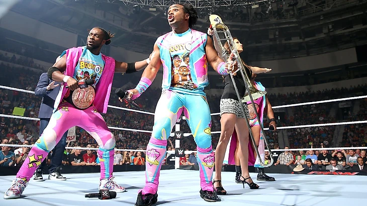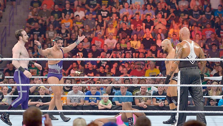 Неделю назад именно эти же коллективы сражались за командное золото на Extreme Rules, и вот снова они вышли на ринг. Поединок получился крепким, без особых изысков и не таил в себе никакой интриги, так как титулы на кону не стояли. Вначале доминировали "Новый день", затем Кофи немного переусердствовал с дурачеством и потерял инициативу. Спустя небольшой отрезок лидерства "водевильцев" Биг И получил "горячий таг" и провёл все свои коронные приёмы, в то время как за рингом начался настоящий хаос, ибо Карл Андерсон и Люк Гэллоуз напали на Ксавье Вудса и Кофи, обозначив свой новый выбранный курс. "Водевиллианс" не стали влезать в эти разборки, предоставив японским вторженцам завершить начатое фирменным "убийцей магии". В послематчевом сегменте Андерсон заявил, что теперь их целью стали командные пояса и это лишь начало.