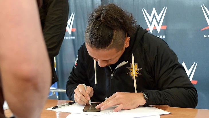 Шинске Накамура оставляет автограф на смартфоне поклонника.