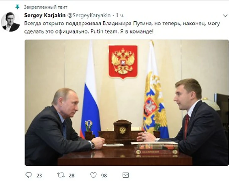 «Всегда открыто поддерживал Владимира Путина, но теперь, наконец, могу сделать это официально. Putin Team. Я в команде!» – написал Карякин в твиттере.