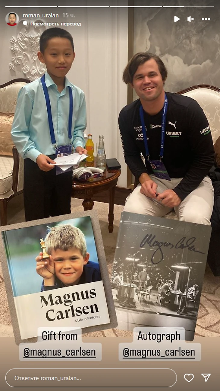 Магнус Карлсен подарил свою книгу 8-летнему российскому шахматисту Шогджиеву