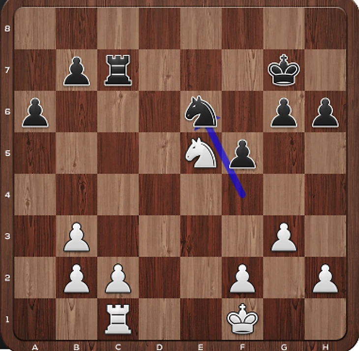 25.Nxd6 Rd8 26.Nc4 Nf6 27.Nb6 Rc7 28.Rac1 Rd6 29.Nc4 Rxd5 30.Rxd5 Nxd5 31.Nxe5 Nf4 32.Kf1 Kg7 33.g3 Ne6