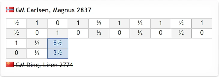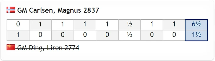 Всё началось с победы Диня. Он показал быструю и точную игру. Всем показалось, что интрига в матче вернётся. Но нет. В дальнейшем китайский гроссмейстер едва унёс ноги: 6 поражений при одной ничье: