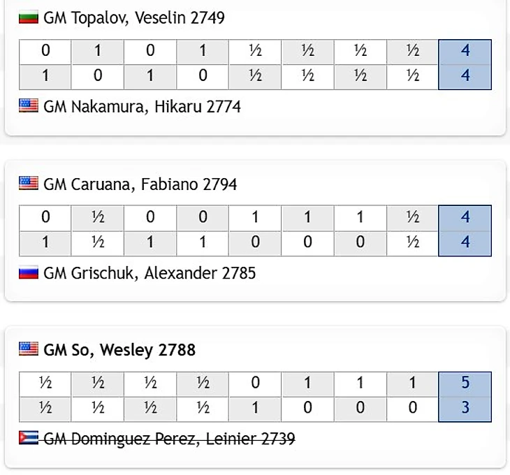 Каруана - Грищук; Накамура - Топалов; Со - Домингес; Карлсен - Лижень