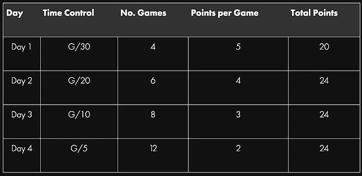 Регламент турнира подразумевает 4 соревновательных дня, в каждом из которых состоится от 4 до 12 партий в зависимости от контроля (30, 20, 10 или 5 минут). В каждой партии разыгрывается определенное количество очков. С уменьшением контроля уменьшается и "стоимость" партии: