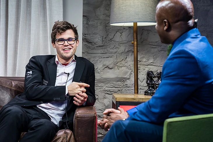Магнус был весел и расслаблен. В интервью он поделился своими мыслями насчет регламента турнира, ведь в отличие от участников других матчей он не доходил до рубки флагов: