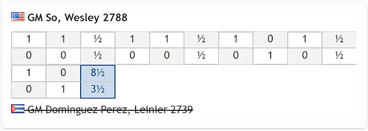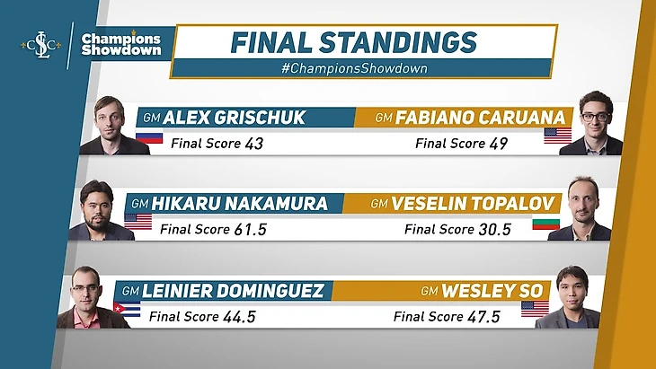 Напомним, что Магнус, Со, Каруана и Накамура выиграли по $60,000 (€50,800) за победу в матчах, в то время как Динь, Домингес, Грищук и Топалов получили по $40,000 (€33,870) за участие.