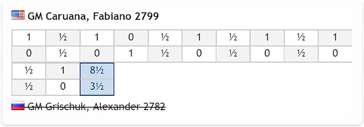 Каруана должен выигрывать "+2" (7-5) для ничьей или "+3" (7.5-4.5) для победы. В случае равенства очков, пара не будет играть тайбрейк и просто разделит призовой фонд: каждый получит по $50,000;