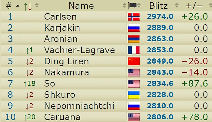 По результатам турнира Грищук потерял 90 очков блиц-рейтинга и 26 позиций. Со и Каруана же ворвались в топ-10: