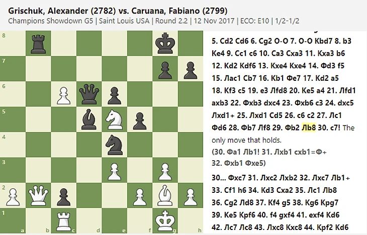 Видно было, что Грищук не в форме, когда он раздумывал над одним ходом больше минуты, принимая в итоге неоднозначные решения. Хотя, российский гроссмейстер временами и поднимал мощные и единственные решения, как в следующей позиции