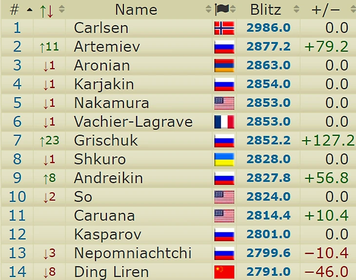 Великолепная победа Владислава Артемьева в турнире IMSA Elite Mind Games 2017 в китайском городе Хуайань позволила ему подняться в блиц-рейтинге ФИДЕ на 11 мест, заняв вторую строчку и попутно обойдя действующего чемпиона мира по блицу Сергея Карякина: