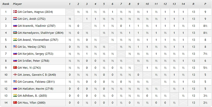 Тем не менее, нельзя сказать, что Магнус рвал всех подряд. Достаточно взглянуть на финальную таблицу и отметить оппонентов, в противостоянии с которыми, он набирал очки. В этом плане победы Гири над Крамником и Мамедьяровым кажутся куда весомее.