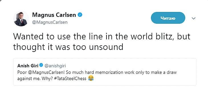 На фоне заключительного противостояния очень забавно выглядела их шутливая перебранка в твиттере сразу после сыгранной классической партии, в которой Магнус пошёл на сложную компьютерную линию, но переиграть Гири черными не получилось: