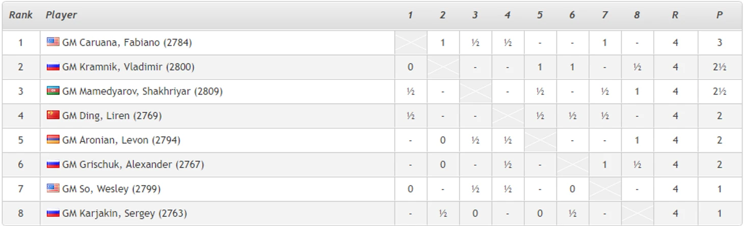 Таким образом, Фаби захватывает лидерство после 4 тура, а Карякин погружается на последнее место с "-2":