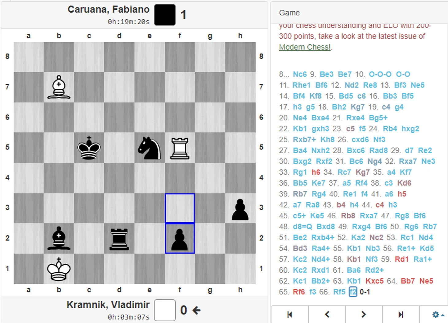 Карякин, внезапно для многих, пожертвовал в дебюте сразу две пешки за инициативу, но столкнулся с осложнениями, в которых не придумал ничего лучше, чем перейти в эндшпиль без одной. Аронян технично и цепко реализовал материальный перевес:
