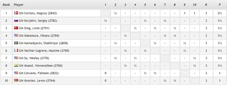 Турнирная таблица, в которой есть Магнус и остальные: