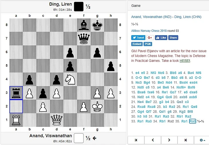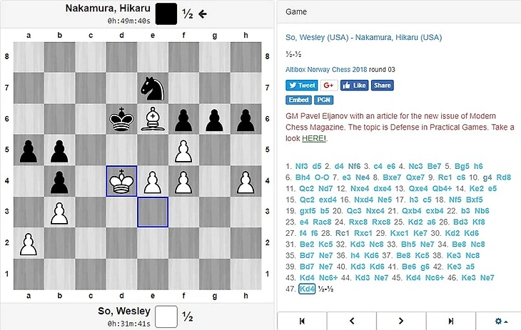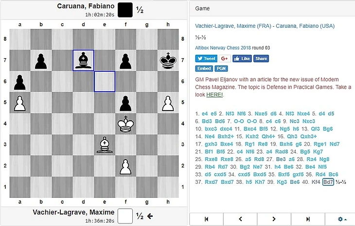 И снова Фабиано и снова Русская партия. МВЛ интересно трактовал дебют, уйдя в короткую сторону, что преобразило позицию, но игроки не ошибались и свели партию к "разноцвету":