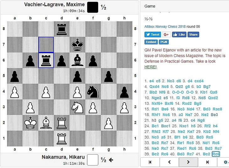 Накамура: "Уэсли не был готов к славянской защите, поэтому пошел на скучный разменный вариант и Магнус решил спровоцировать его. И теперь у Магнуса много проблем."