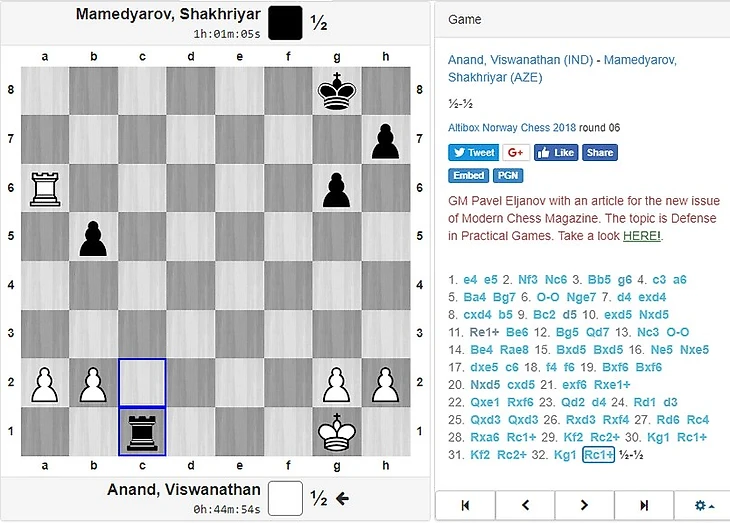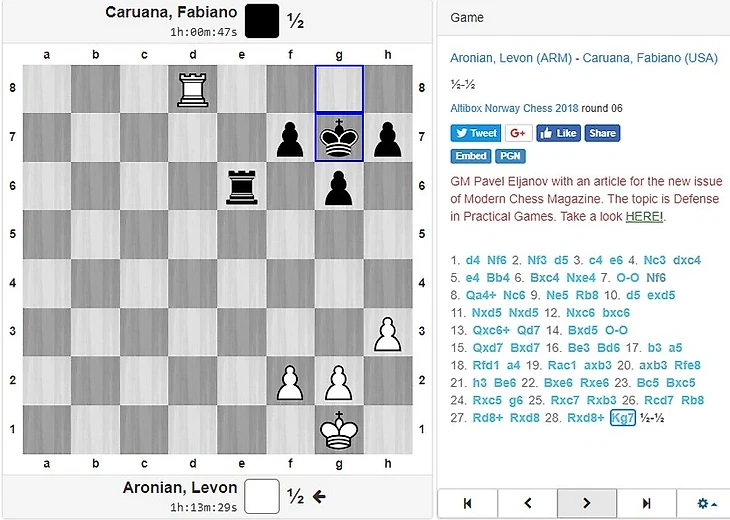 Испанская партия. Черные неплохо вышли из дебюта и играли нанебольшой плюсик, получив проходную пешку. Другое дело, что при ферзях она далеко не пошла, оказалась съеденной и в очередном ладейнике оппоненты зафиксировали ничью.