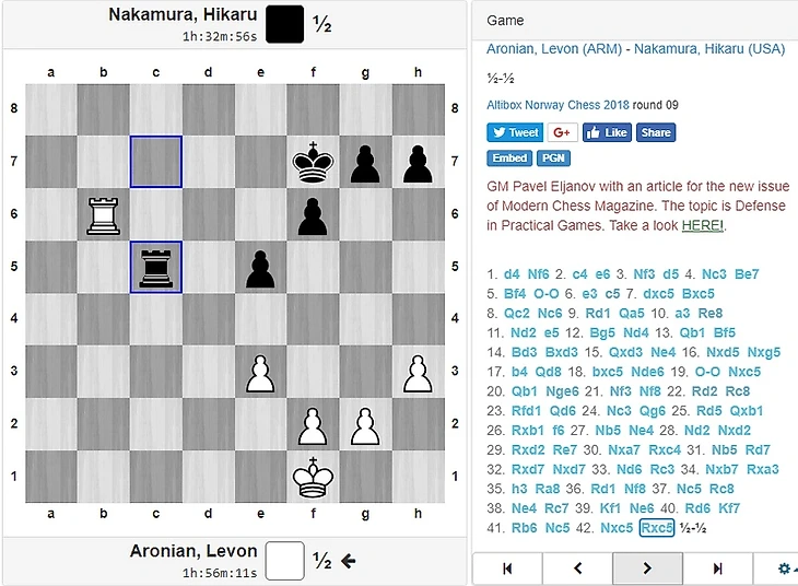В этой партии американец был заряжен на борьбу и это было заметно: он с дебюта набрасывал фигуры, подкручивал позицию разными методами. И в какой-то момент получил преимущество в пешечной структуре. Однако Левон выкрутился из сложной ситуации и сохранил материальное равновесие. Финальная позиция должна держаться за оба цвета. Но это не точно: