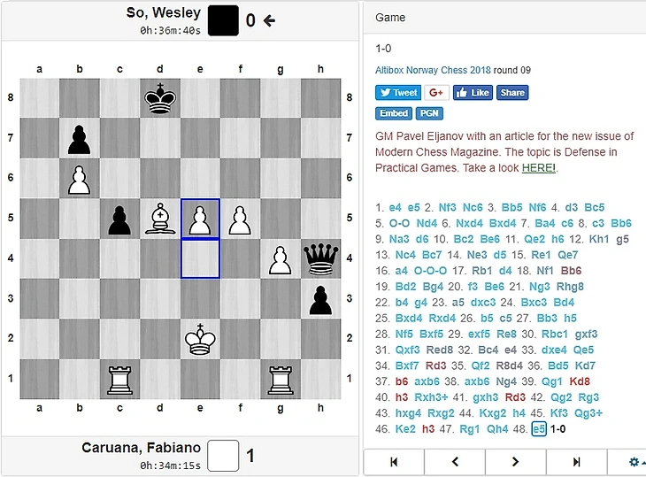 Нужно сказать, что в какой-то момент Уэсли имел пересвес, но промедлил и упустил его. Спустя десяток неточных ходов дым рассеялся и выяснилось, что Со стоит на поражение без материала и атаки. Пришлось отдавать кучу фигур за ферзя и оставаться в безнадежном соотношении: