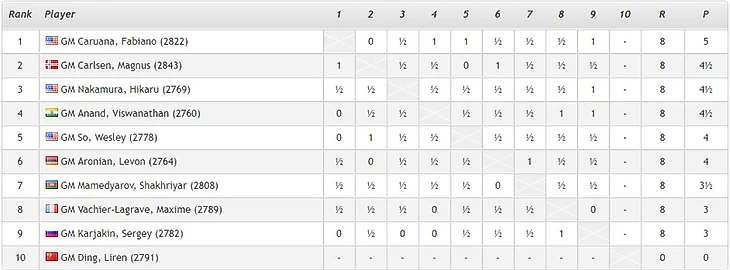 Перед заключительным туром возможность победить оставалась у всех американцев, Магнуса и даже у Ананда. При дележе первого места запустили бы стандартную процедуру из двух блиц-партий и "армагеддона", но этого не понадобилось…