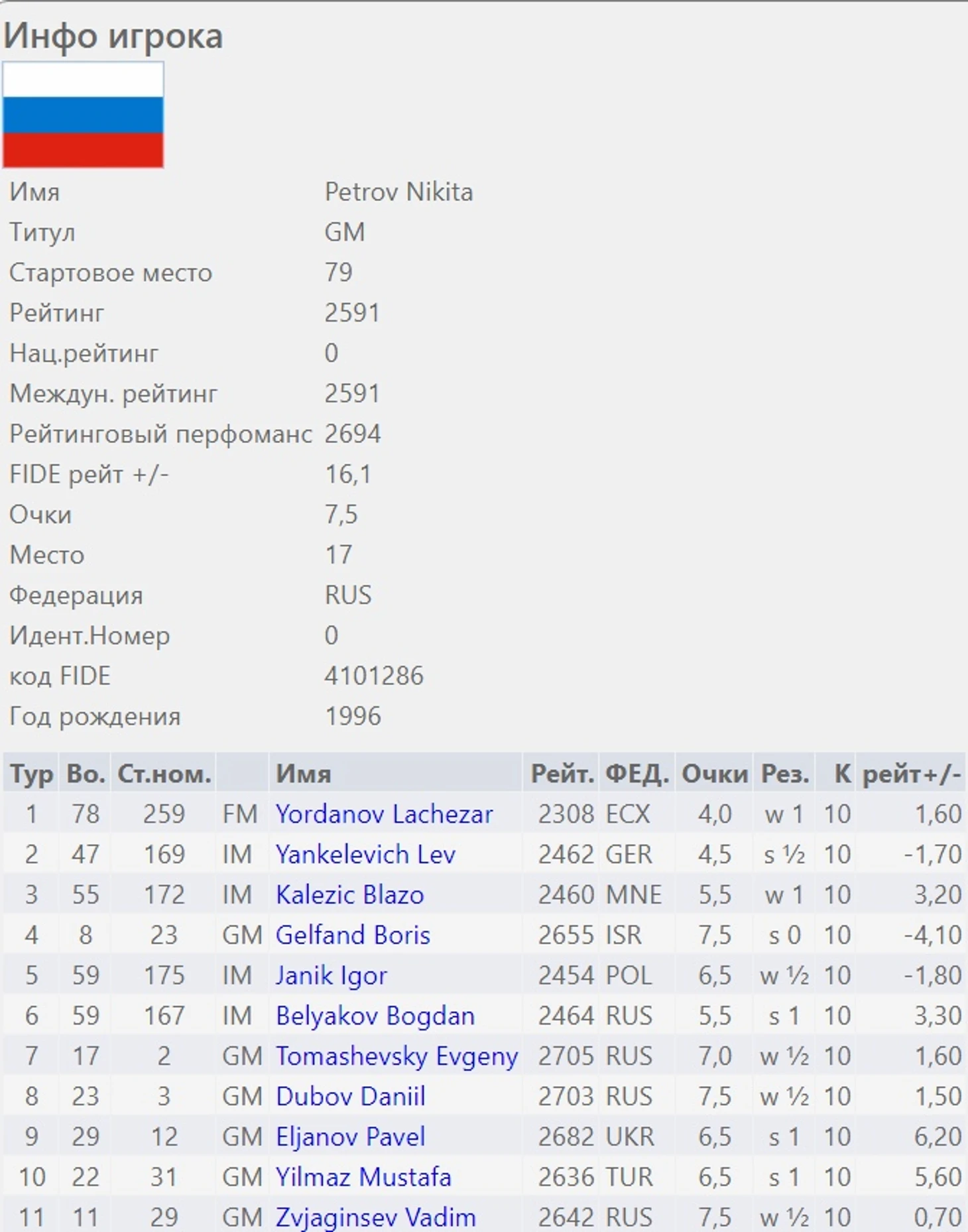 Никита Петров занял 17-е место в турнире, сразившись с гроссмейстерами 2700+ настоящего и прошлого (Борис Гельфанд - участник матча на первенство мира 2012 года; максимальный рейтинг Павла Эльянова - 2761 пункт Эло). Таким образом, Никита завоевал путёвку на Кубок мира, а также денежный приз (говоря языком покера, 20 человек попали в ITM).