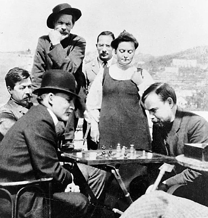 A famous shot: At Maxim Gorky’s, Lenin plays against his political opponent Alexander Bogdanov. Gorky, a prominent Russian writer and also chess admirer, watches on.