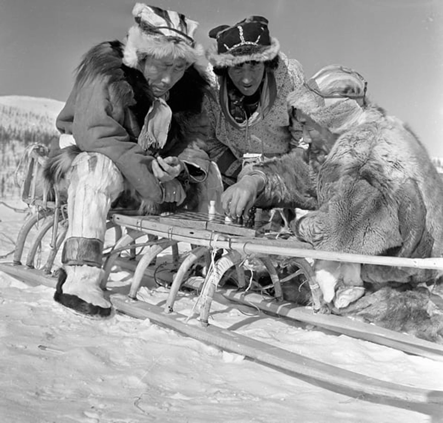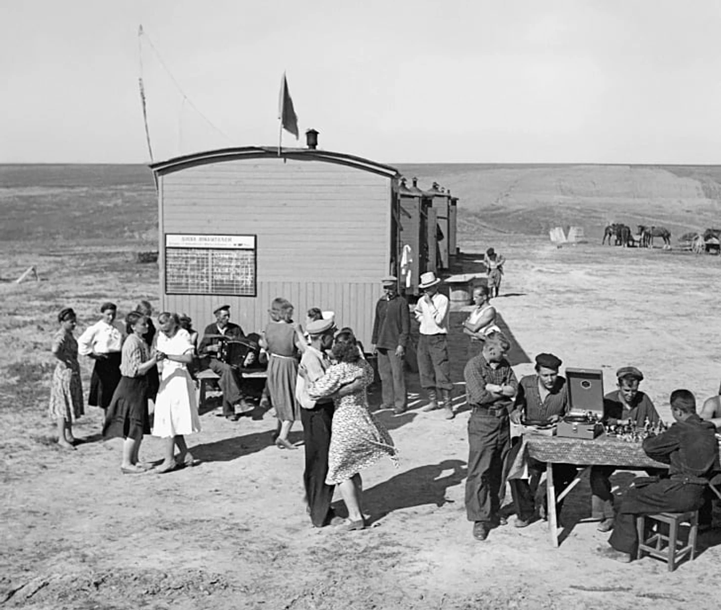 Smart leisure time for Tselina (Virgin Lands) workers in a Kazakh steppe, some time around the 1960s: accordion, phonograph, dancing, chessboard… by night everyone goes back to their cabin.