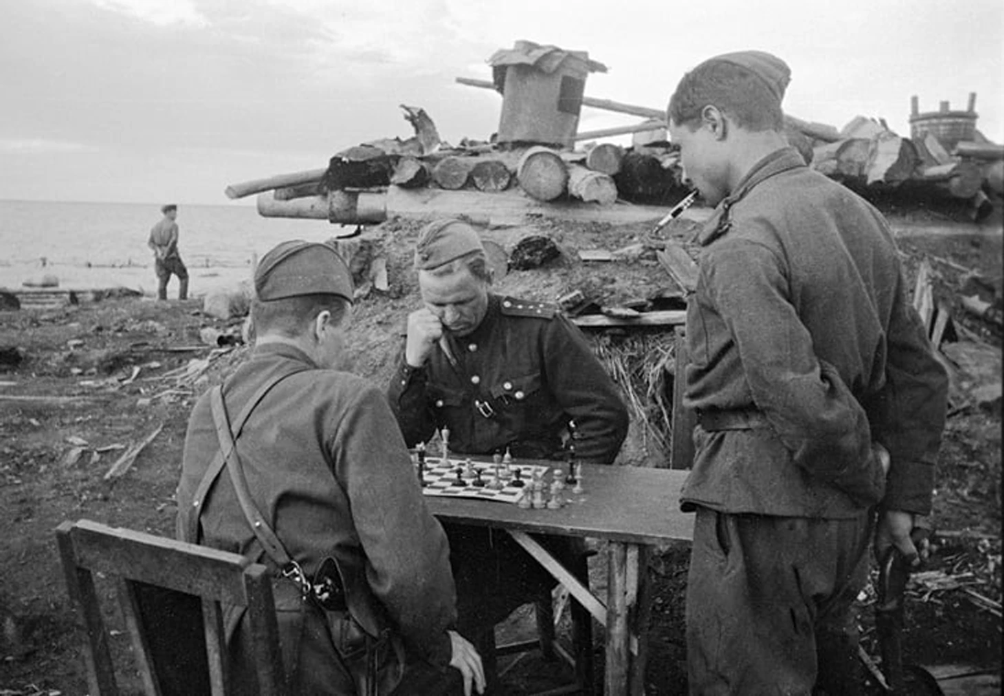 Even during the World War soldiers had rest around the chess board. Stripes, holster, reinforcements and cardboard (on the shore of Lake Ilmen, summer of 1943).