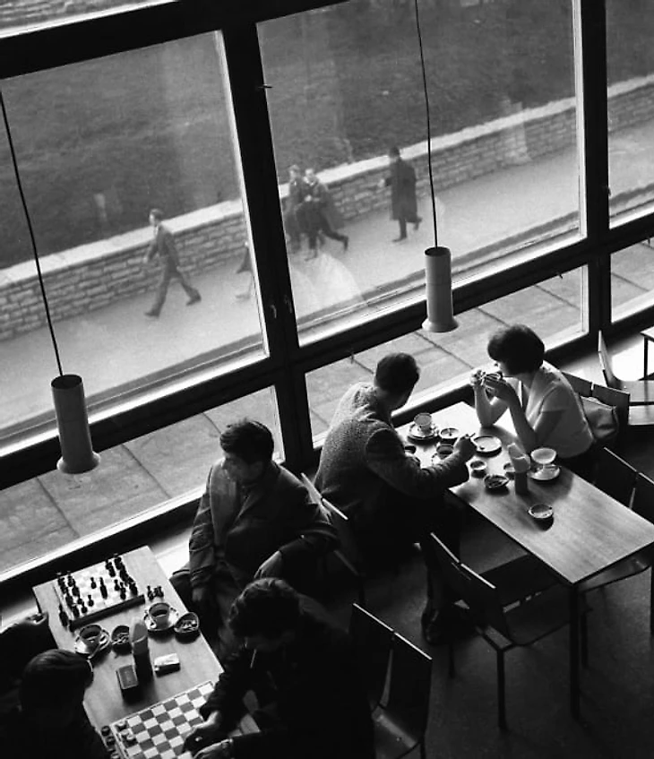 Same epoch, same country, just a few thousand kilometres to the west. Coffee and chess at a cafe in Tallinn.
