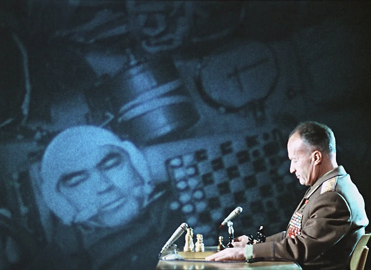 Soyuz-9 commander Andriyan Nikolaev has an online game of chess with his colleague who stays on Earth (a shot from the film ‘Back to the Future’).