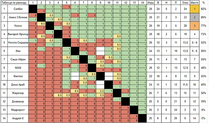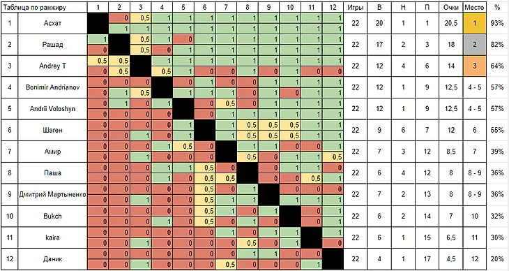 Andrey T на третьем месте. И вот это уже настоящий подвиг. В своём первом посте я даже забыл посчитать шансы Андрея на бронзу, но он всех наказал. Уверенно провёл оставшиеся матчи, дважды победил Андрей Волошина и стал бронзовым призёром турнира.