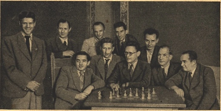 Участники советской команды. Слева направо: А. Лилиенталь, И. Болеславский, А. Котов, В. Макогонов, В. Смыслов, И. Бондаревский, М. Ботвинник, Д. Бронштейн, В. Рагозин и С. Флор