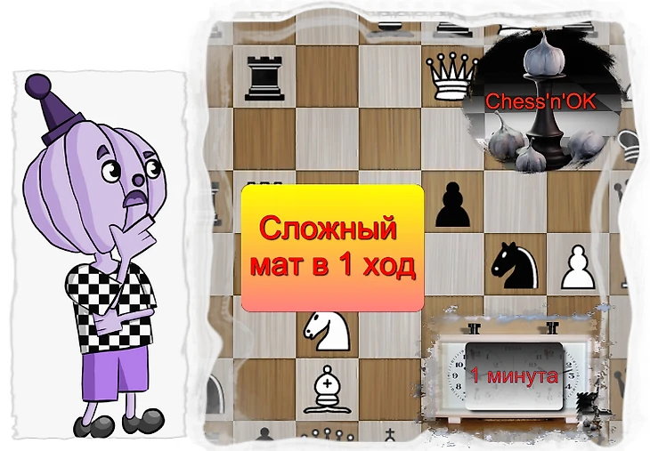 Отличная задача для тех, кто хочет немного подумать. Мат в 1 ход здесь ставят белые фигуры в 1 ход, но и черные, если бы начали первыми, смогли зашаховать соперника за 5 ходов.