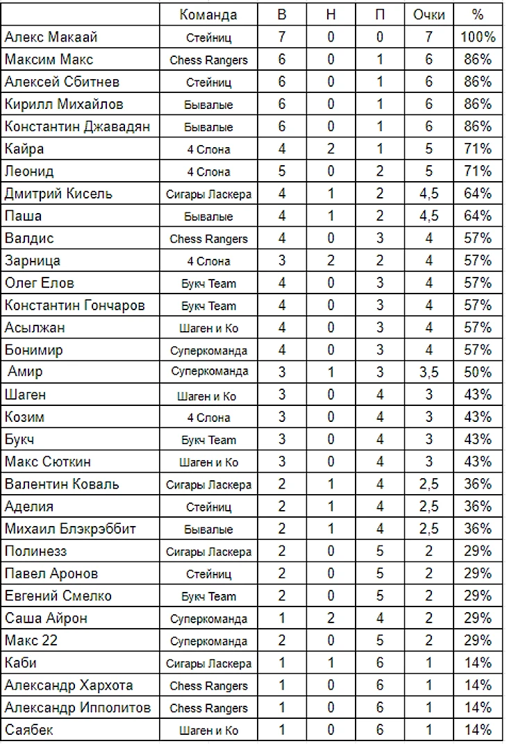 Неплохо смотрелась и Суперкоманда, оказавшаяся чуть ниже шагеновцев лишь по допам. Если бы ребята не раздали несколько почти выигранных партий, то имели очень неплохие перспективы.