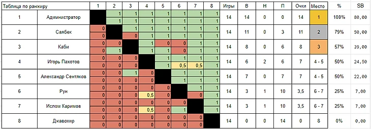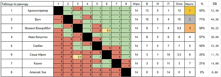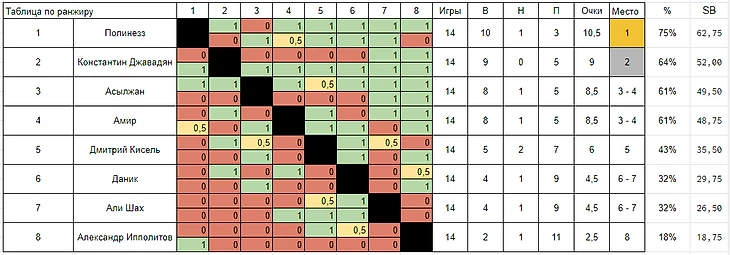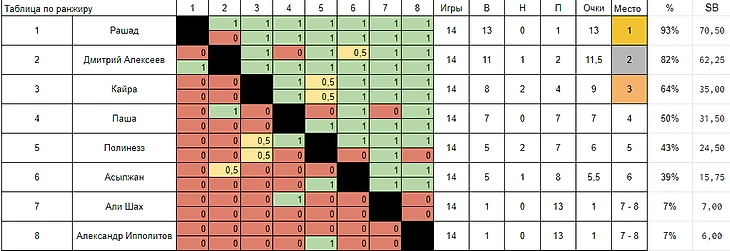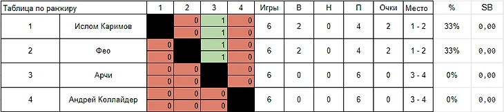 Администратор прошёлся катком по группе, которая оказалась очень сильной и забористой. А вот за 2 место развернулась настоящая битва. К слову, здесь ещё и игрался армагеддон за места, который уверенно выиграла Рун во встрече против Ислома Каримова. Джавохир по ходу турнира снялся.