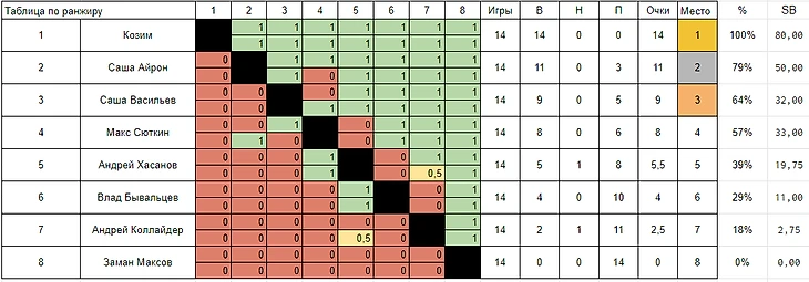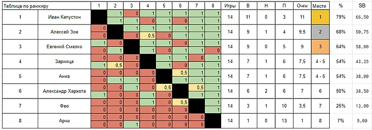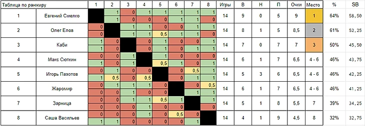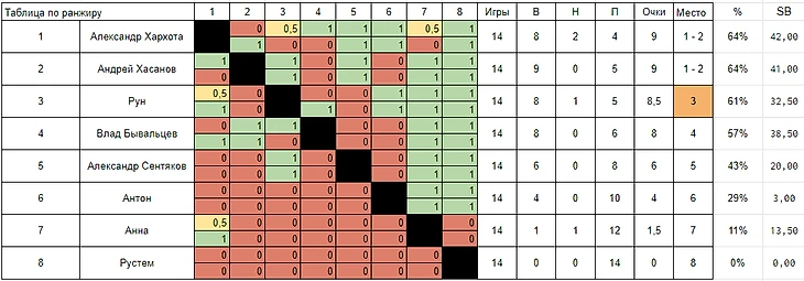На четвёртой позиции Паша. И это отличное выступление и хороший прогресс. Паша сумел взять очки у всех призёров кроме Бонимира, при этом неплохо отыграв с расположившимися ниже. Кайра стал пятым, прибавляя от игры к игре.