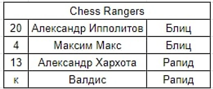 Те же 6 очков удалось завоевать Chess Rangers и ниже они лишь по дополнительный показателям. Ребята чередовали яркую игру с небольшими промашками, но в целом выступили удачно.