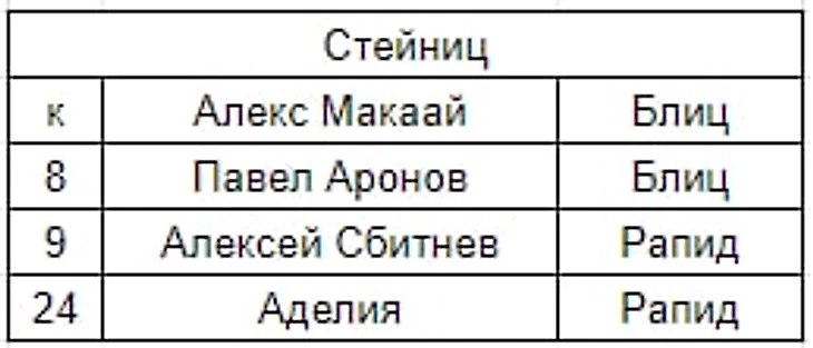 Вторыми стал клуб Стейниц. Парни и девушка играли стабильно, не разбрасываясь очками. Алекс Макаай и вовсе выиграл все встречи.