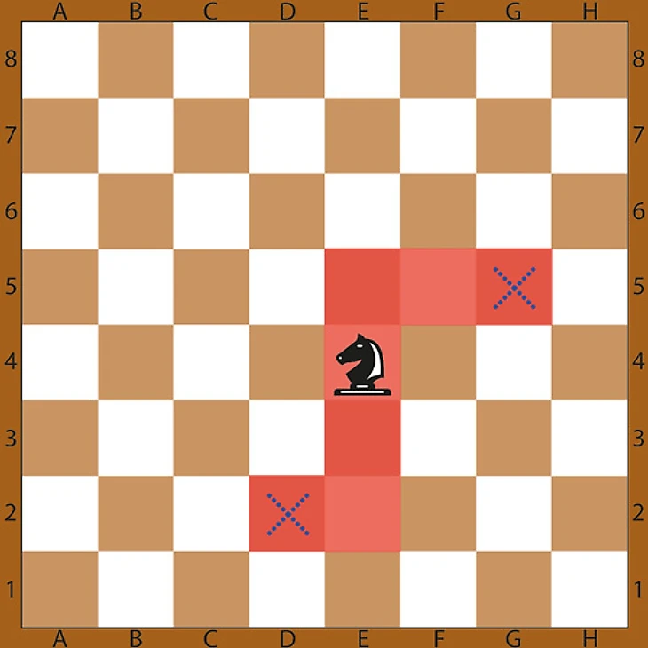 От клетки, где стоит Конь, траектория движения захватывает 2 клетки вперед по горизонтали или вертикали, и еще одну клетку в сторону, чтобы получилась буква Г. Фигура соперника, которую планируется взять в плен должна находиться на клетке, образующей букву Г в траектории хода коня.