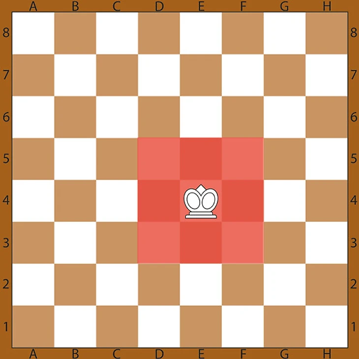 Ходит на одну клетку вперед, назад, по диагонали или в бок. Может сбить фигуру, стоящую рядом, если она не защищена любой другой. Ударить фигуру, стоящую на клетке под защитой — король не может.