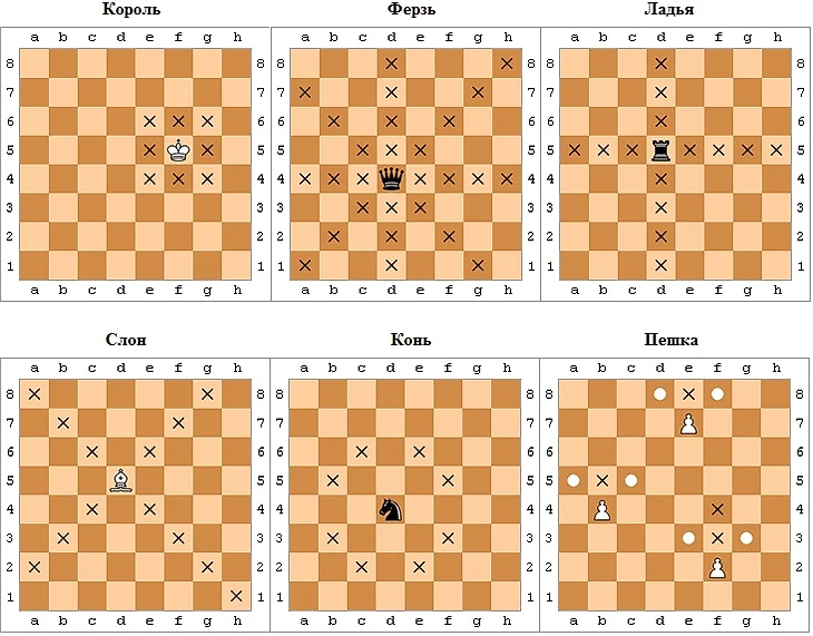 Слон может ходить в любую сторону, на любые расстояния по диагонали, а ладья может двигаться аналогично по прямым линиям. Она может поражать соперника по вертикали или горизонтали, на любом расстоянии.