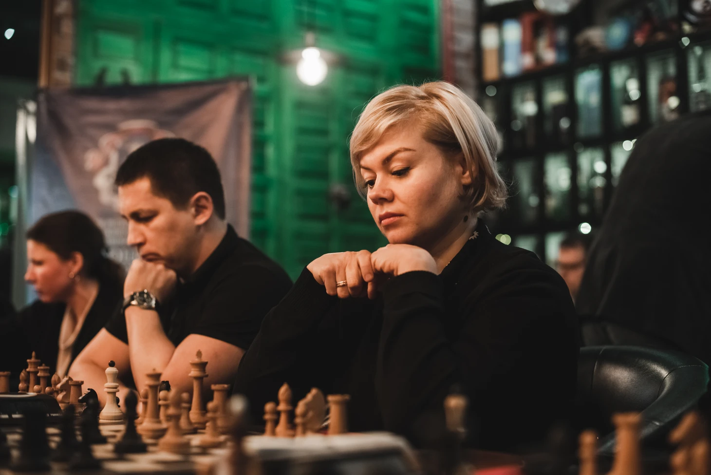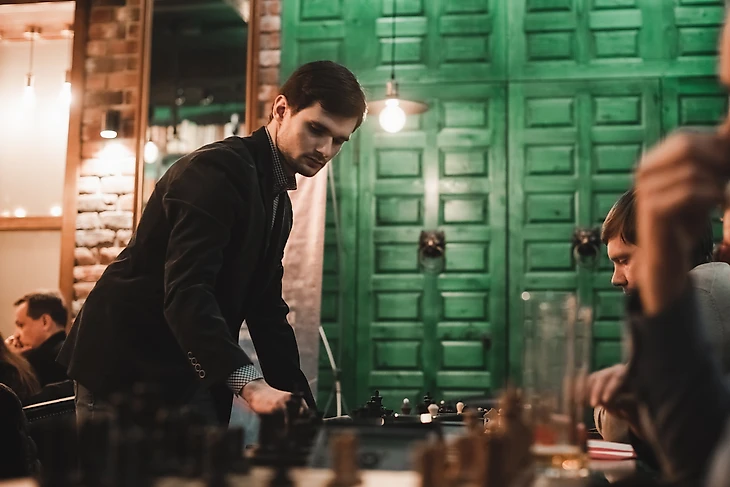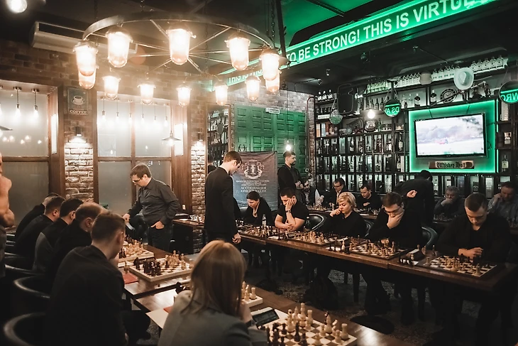 Формат матча придумали такой, чтобы усложнить жизнь опытным шахматистам – сеанс одновременной игры, в котором 1 опытный шахматист сыграл против 5 бизнесменов/юристов! Играли рапид, две партии.