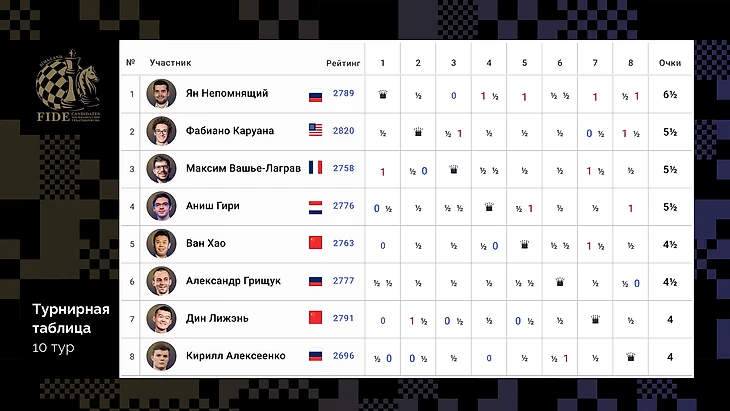 Положение участников после 10-го тура: 1. Непомнящий (Россия) – 6,5; 2-4. Каруана (США), Гири (Голландия), Вашье-Лаграв (Франция) – 5,5; 5-6. Грищук (Россия), Ван Хао (Китай) – 4,5; 8. Алексеенко (Россия), Дин Лижэнь (Китай) – 4.