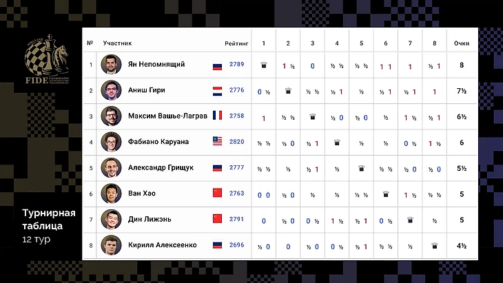 Положение участников после 12-го тура: 1. Непомнящий (Россия) – 8; 2. Гири (Голландия) – 7,5; 3. Вашье-Лаграв (Франция) – 6,5; 4. Каруана (США) – 6; 5. Грищук (Россия) – 5,5; 6-7. Дин Лижэнь, Ван Хао (оба – Китай) – 5; 8. Алексеенко (Россия) – 4,5.