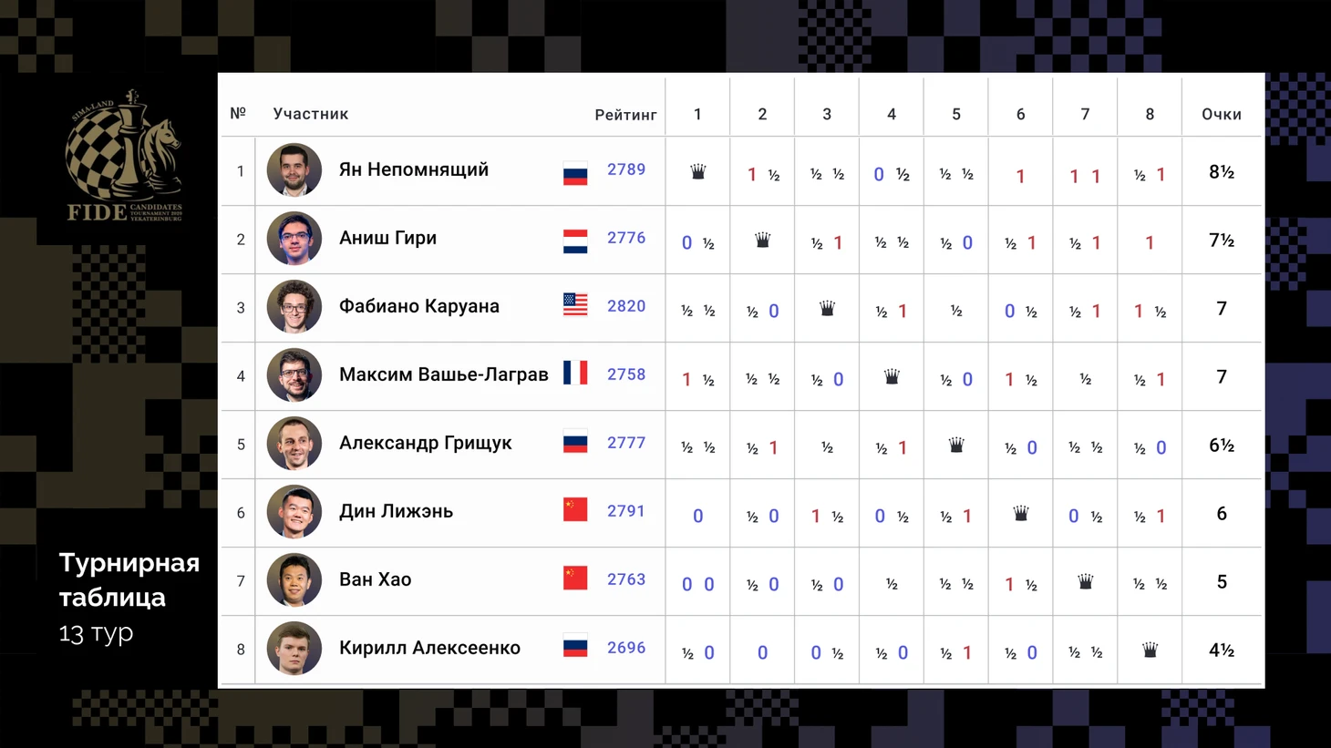 Положение участников после 13-го тура: 1. Непомнящий (Россия) – 8,5; 2. Гири (Голландия) – 7,5; 3-4. Вашье-Лаграв (Франция), Каруана (США) – 7; 5. Грищук (Россия) – 6,5; 6. Дин Лижэнь (Китай) – 6; 7. Ван Хао (Китай) – 5; 8. Алексеенко (Россия) – 4,5.