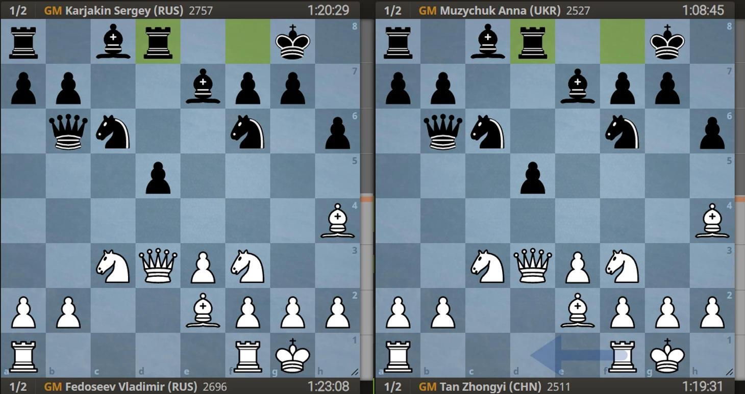 Владимир Федосеев не смог одолеть белым цветом Сергея Карякина, а Тань Чжунъи расписала “мировую” против Анны Музычук в матче за третье место. Интересно, что эти партии развивались в защите Тарраша абсолютно одинаково до 13-го хода и только потом пошли своими путями.