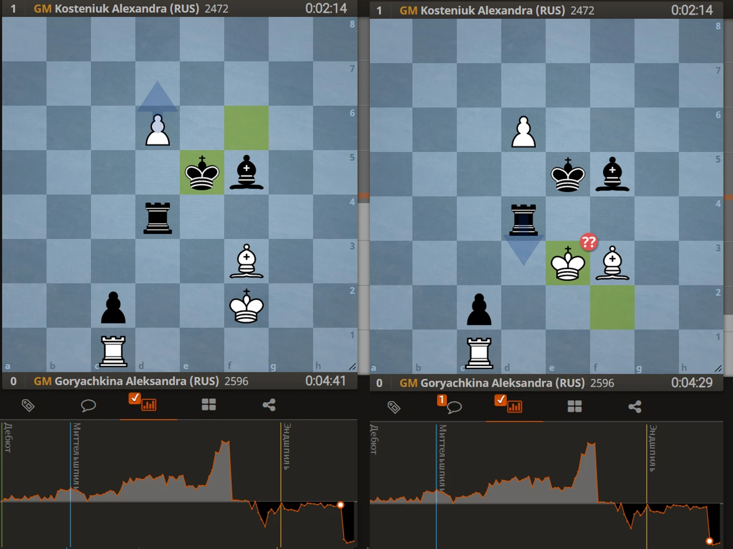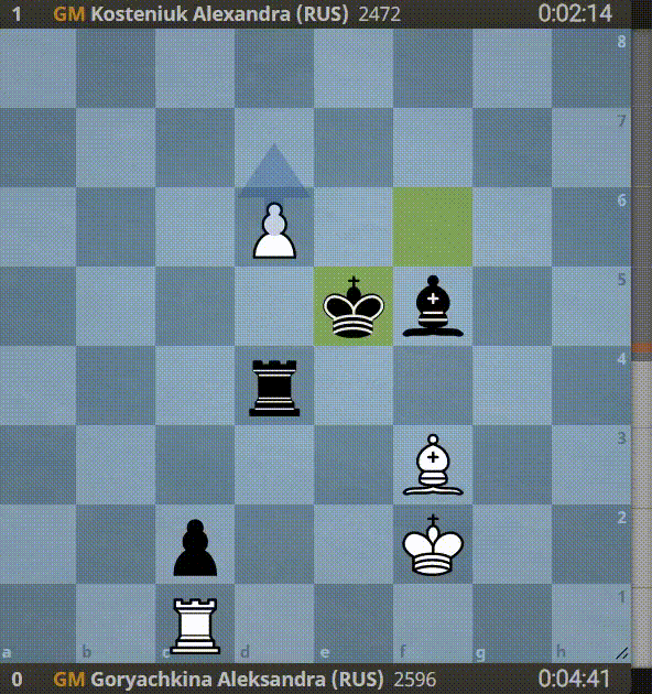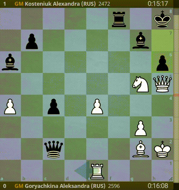 Затем уже черные перехватили инициативу и начали поддавливать. В критический момент Горячкина не справилась со сложностью эндшпиля, допустив ошибку ходом 53.Крe3 вместо 53.d7